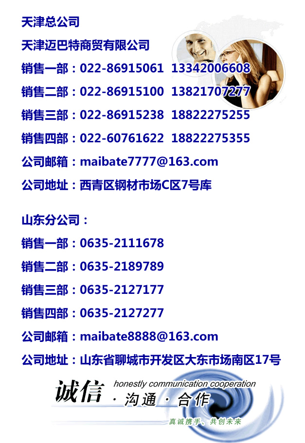 销售一部:022-86915061 13342006608 销售二部: 022-86915100 13821707277 销售三部:022-86915238 18822275255 销售四部:022-85100234 18822275355 公司地址:西青区钢材市场C区7号库